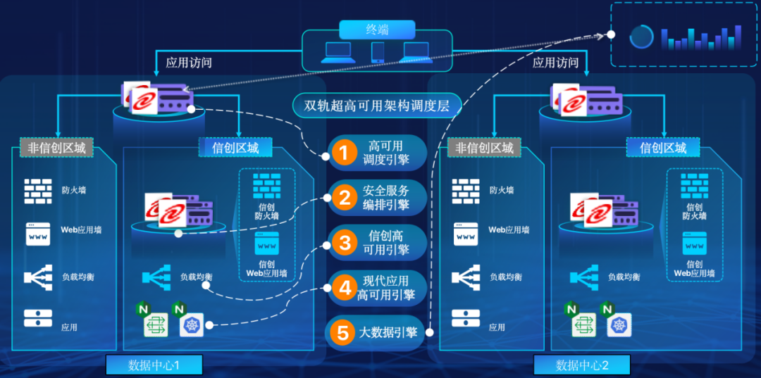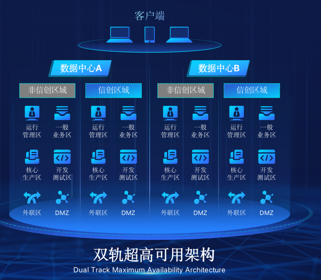 星空xk在企业面临自主创新IT基础重构过程中,推出的全新架构双轨超高可用架构(简称DTMAA),在双活数据中心的分区调度基础上,添加每个数据中心内信创域和非信创域的分域调度,来实现分区分域协同的多活双轨超高可用。